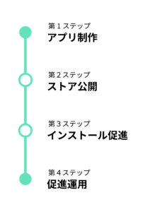 お客様がアプリを活用した販促を実現できる状況に至るためには、以下の4つのステップが必要です。 第1ステップから第2ステップまでは、ZIZAIの料金に含まれています。 第3ステップから第4ステップは、お客様ご自身で実践する必要があります。